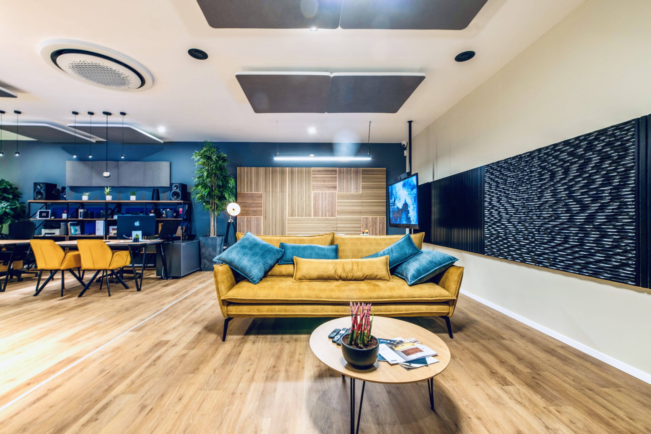 - אזורים שקטים – עם ספיגה אקוסטית אגרסיבית מוגברת באמצעות פאנלים אקוסטיים או פריטים סופגי קול אחרים